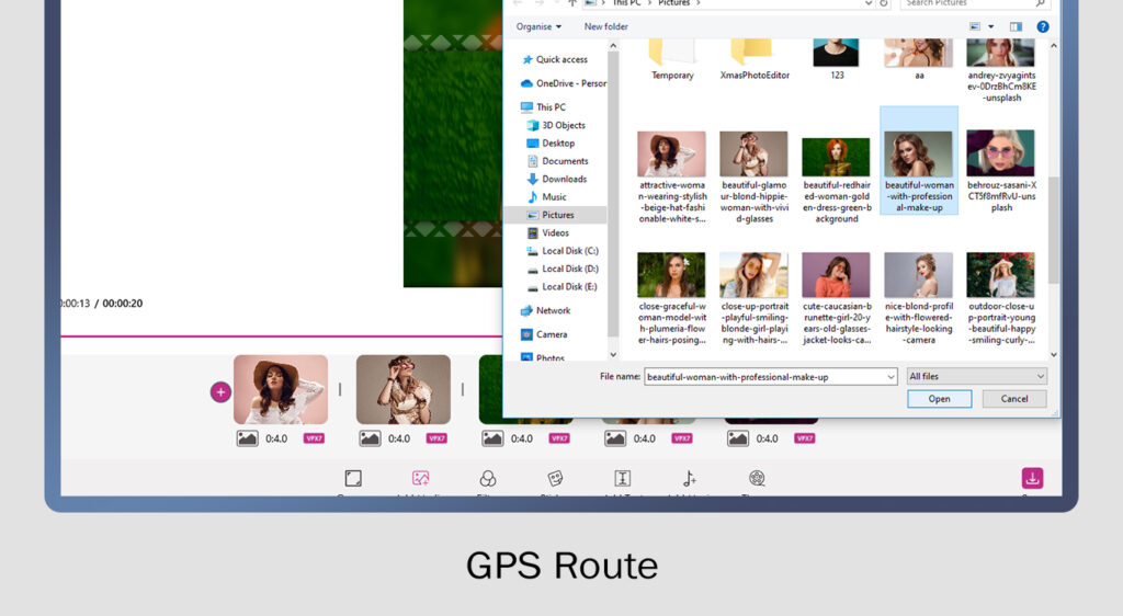 Use the slideshow maker to craft a dynamic presentation by selecting images from the picture library. Customize it by adding transitions, setting image durations, applying frames, attaching stickers and texts, and even adding background music for a perfect video.