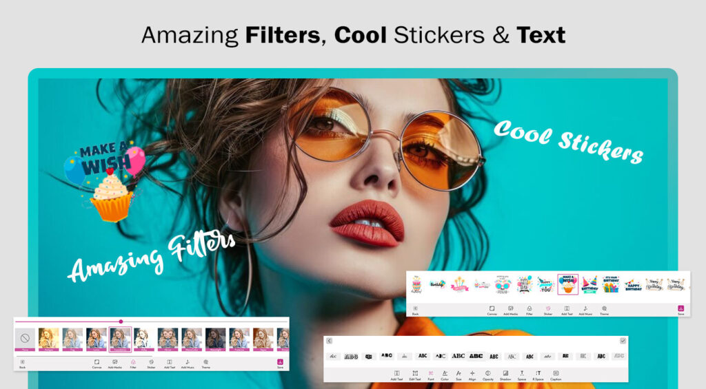 The Video Editor allows you to choose one or more videos from the library for editing. Add filters, stickers or emojis, texts, and amazing effects to elevate your video content.