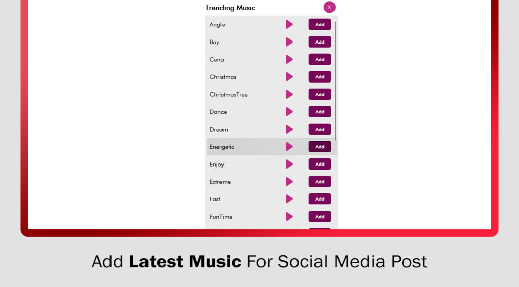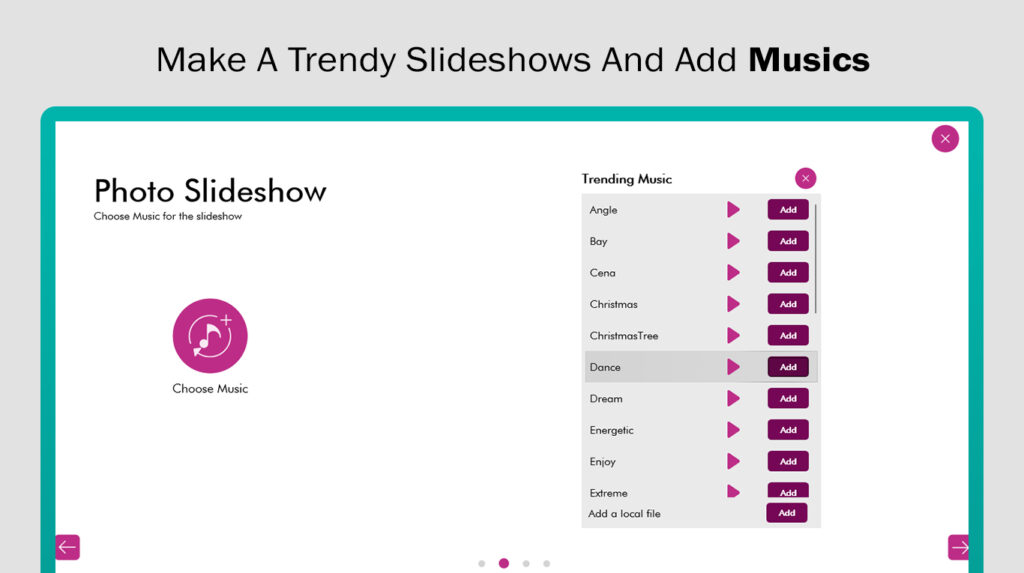 - Add music to your slideshow of your choice by using the ‘Add Music’ icon. You can select it from the app’s collection or from your device’s library.