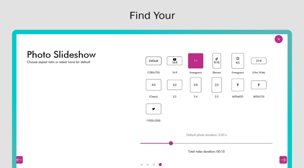 Click on the ‘Canvas‘ button on the Video Editing screen, and you’ll be directed to a separate window with multiple options. There are 14 options with different screen ratios to fulfill your various social media needs. Starting from 16:9, commonly used for YouTube and Facebook posts, to the 1:1 ratio, ideal for IGTV and Instagram posts. Additionally, there’s a specially designed ratio of 9:16, commonly used for Instagram Stories, Facebook stories, TikTok, and other popular social media apps. Another option is the 4:5 ratio, perfect for creating quick posts and long IGTV videos to enhance your visibility on social media.